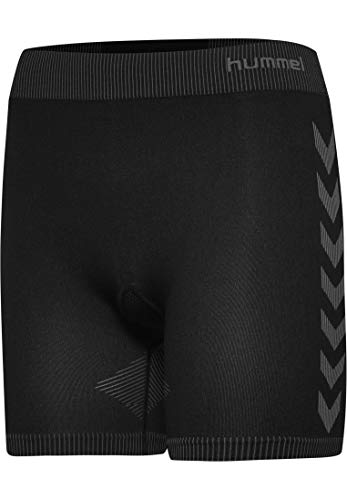 De zwarte, knielange Hummel First naadloze korte broek tights voor dames met smalle, aerodynamische design is gestroomlijnd en super rekbaar en combineert een sportief-chique Chevron-motief met gebreid Hummel-logo.