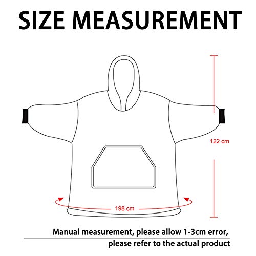 EEN PAK VOOR IEDEREEN: zeer groot en ruim, geschikt voor volwassenen en jongens en meisjes vanaf 14 jaar. Aan het einde van de mouwen bevinden zich elastische manchetten, zodat je de mouwen op hun plaats kunt bevestigen en je handen vrij kunnen bewegen. Doe een super warme en comfortabele ervaring op. De deken kan in de machine worden gewassen en gedroogd op een goed geventileerde plaats.