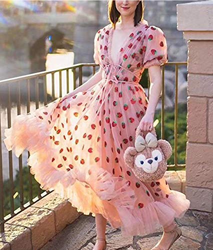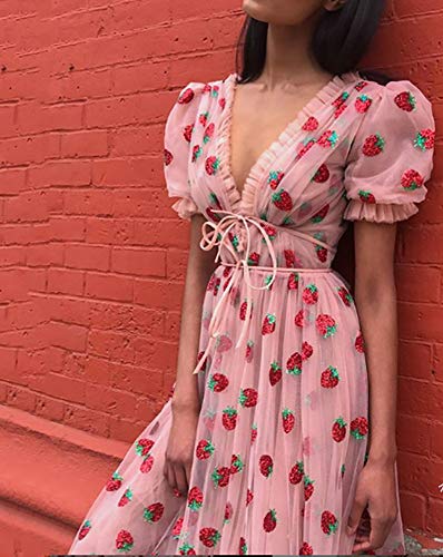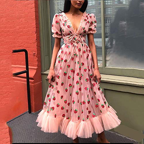 Specification: BAINA dames casual jurk, lange damesjurk met sexy V-hals, jurk met bandjes in mesh, aardbei, effen kleur cocktailjurk…