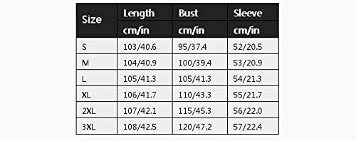 Maattabel ::SLength (cm/in) ::103/40,6 Bust(cm/in) :::95/37,4 mouw (cm/in) ::52/20.5Maat: MLength (cm/in) ::104/40.9 Bust(cm/in) :100/39.4mouw (cm/in) :::53/20.9Grootte: LLengte (cm/in) : :105/41.3Bust(cm/in) ::105/41.3mouw (cm/in) ::54/21.3Grootte: XLLengte (cm/in) ::106/41.7Bust(cm/in) ::110/43.3mouw (cm/in) ::55/21.7Maat: 2XLLengte (cm/in) ::107:107 /42.1Bust(cm/in) ::115/45,3 mouw (cm/in) ::56/22Maat: :3XLLengte (cm/in) ::108/42,5 Bust(cm/in) ::120/47,2 mouw (cm/in) ::57/22,4
